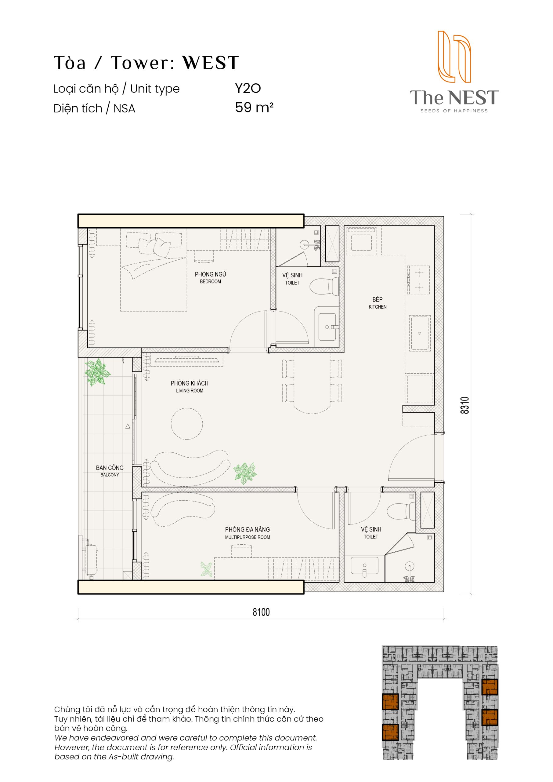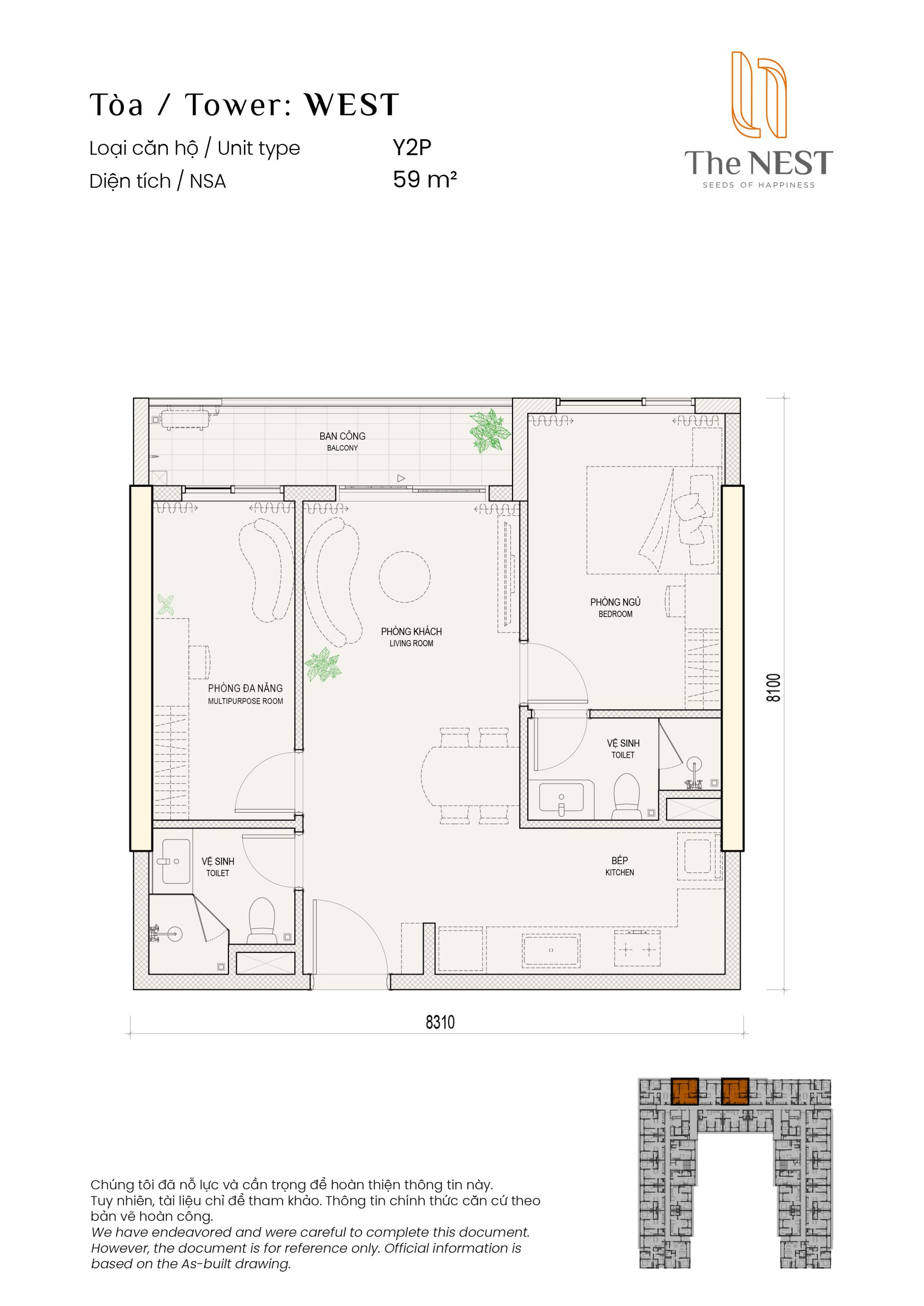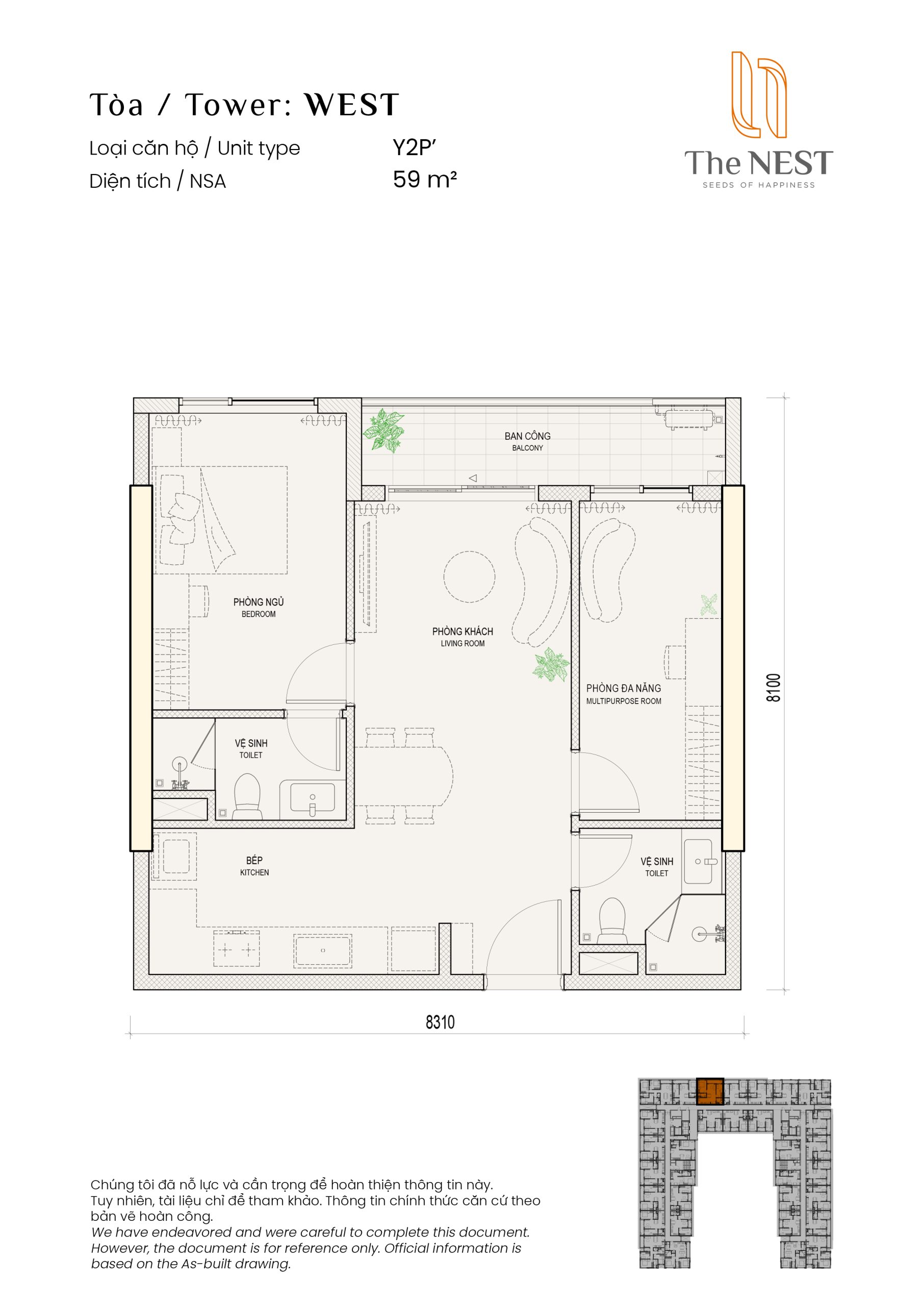 Layout căn hộ 1PN1 +2WC diện tích sàn 59m2